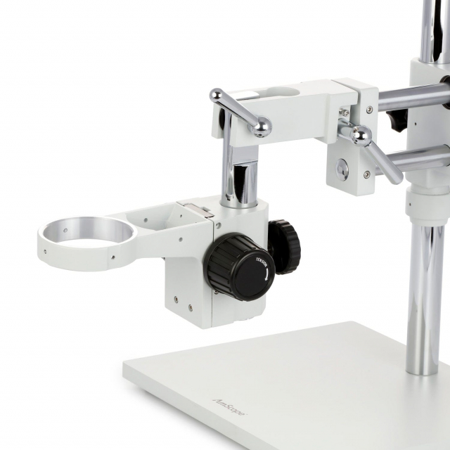 - Heavy-duty double-arm boom stand for stereo microscopes allowing you to point microscope head in ANY direction desired