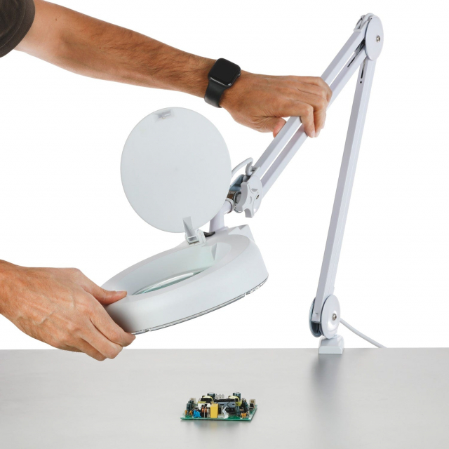 Three points of adjustment on the sturdy metal arm allow you to lock the lamp head at any position as needed. Comes with a surface clamp to allow for optimal placement and mobility within your workspace. Perfect for electronics manufacturing, manufacturing inspection, soldering, repair work, lab work, medical and dental offices, studying, writing, reading, etc.