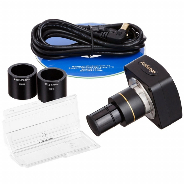 Monitor and capture photos and videos with the included 1.3MP USB 2.0 camera. The C-mount camera is specially designed for use with microscopes, allowing you to watch live images, and to record photos or videos on your computer. This ability to view microscopic images on your computer reduces eye-strain, and allows groups of people to view images at the same time. A 0.37X reduction lens is included for use with 23mm-30.5mm ports to capture more of the microscope's field-of-view. AmScope professional software for Windows provides a wide assortment of capture and photo-editing functions including color correction, time-lapse capture, image stitching, and a full complement of measuring tools. A lite version of AmScope software is comes for Mac and Linux with essential functionality for capturing photos and videos.