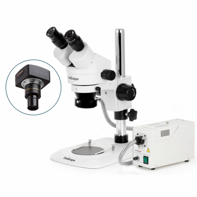 AmScope, SM-1BNZZ-FOR-M, SM-1 Series Zoom Binocular Stereo Microscope, 3.5X-180X Magnification with 150W Halogen Ring Light and 1.3MP, USB 2.0 C-Mount Camera on Compact Pillar Stand