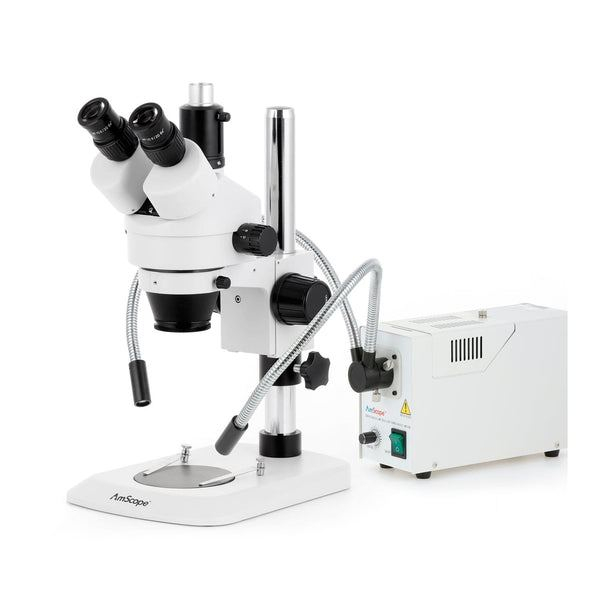 AmScope, SM-1TNYY-FOD-3M, SM-1 Series Industrial Inspection Zoom Trinocular Stereo Microscope 7X-135X Magnification with 150W Halogen Dual Gooseneck Lights and 3MP USB 2.0 C-Mount Camera on Pillar Stand with Small Base