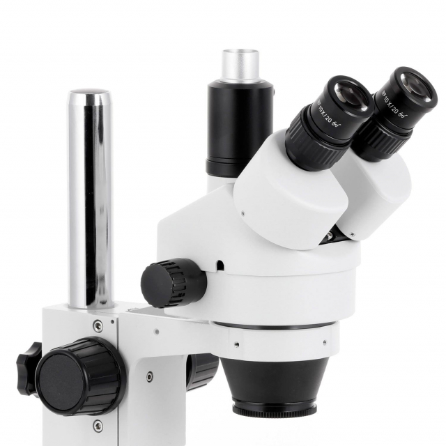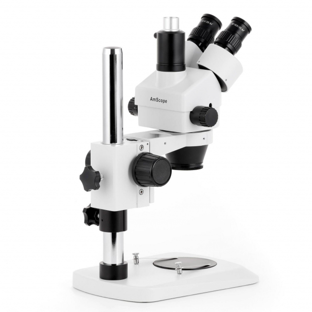 This is a trinocular stereo zoom microscope with a compact stand with 12" pillar. The stand's base has an extended, beveled front edge for comfortable hand placement. The microscope incorporates all the most excellent features of a high quality laboratory instrument. Designed to meet the demands of modern microscopy applications, this microscope exceeds all expectations. It comes with SUPER widefield optics and basic table stand. This microscope offers high resolution and good depth within a broad field of view. It provides crystal clear sharp stereo images with a 4" (100mm) native working distance. Its 45 degree inclined ocular tubes ensure an easy observation and rubber eyeguards provide further comfort. Its trinocular port enables you to add photo or video capability.