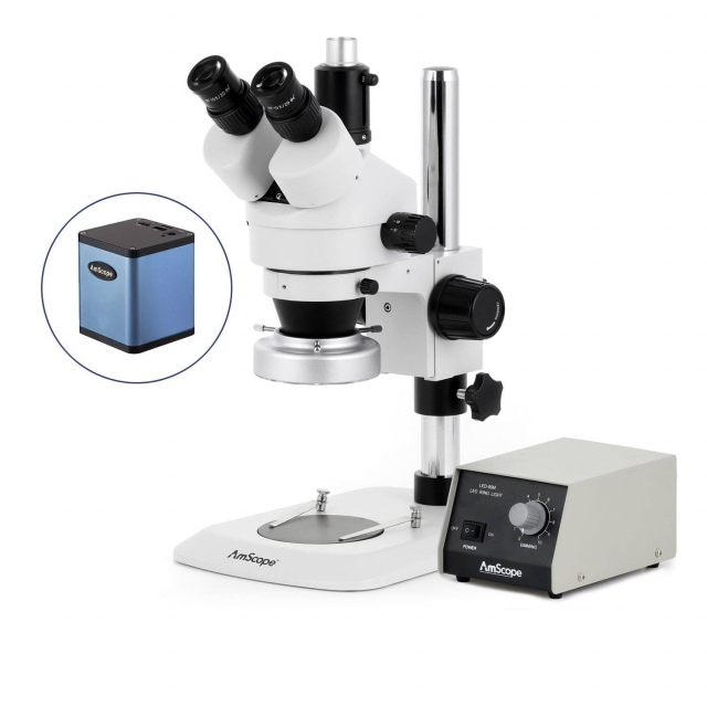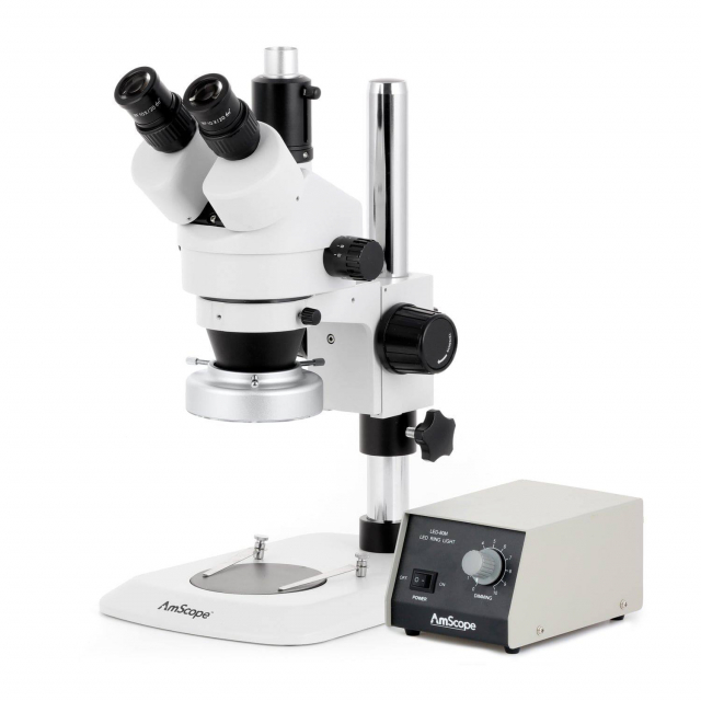 This is a trinocular stereo zoom microscope with a compact stand with 12" pillar. The stand's base has an extended, beveled front edge for comfortable hand placement. The microscope incorporates all the most excellent features of a high quality laboratory instrument. Designed to meet the demands of modern microscopy applications, this microscope exceeds all expectations. It comes with SUPER widefield optics and basic table stand. This microscope offers high resolution and good depth within a broad field of view. It provides crystal clear sharp stereo images with a 4" (100mm) native working distance. Its 45 degree inclined ocular tubes ensure an easy observation and rubber eyeguards provide further comfort. Its trinocular port enables you to add photo or video capability.