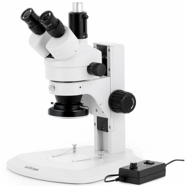 This is a binocular stereo zoom microscope with a precision track-stand. It incorporates all the most excellent features of a high quality laboratory instrument. Designed to meet the demands of modern microscopy applications, this microscope exceeds all expectations. It comes with SUPER widefield optics and offers high resolution and good depth within a broad field of view. It provides crystal clear sharp stereo images with a 4" (100mm) native working distance. Its 45 degree inclined ocular tubes ensure an easy observation and rubber eyeguards provide further comfort. Its trinocular port enables you to add photo or video capability.