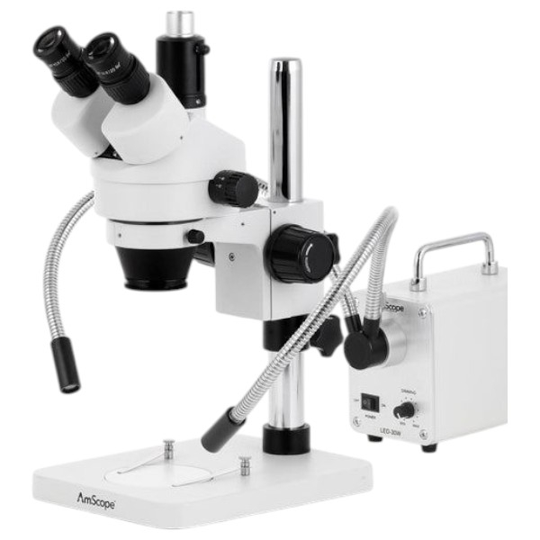 AmScope, SM-1TSZ-30WY-3M, SM-1 Series Zoom Trinocular Stereo Microscope 3.5X-90X Magnification with 30W LED Double Gooseneck Fiber Optic Lights and 3MP USB 2.0 C-mount Camera on Pillar Stand