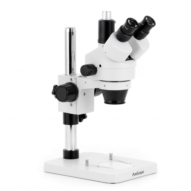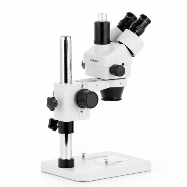 This is a trinocular stereo zoom microscope with a compact stand with 12" pillar. The stand's base has a small footprint to take up minimal space. The microscope incorporates all the most excellent features of a high quality laboratory instrument. Designed to meet the demands of modern microscopy applications, this microscope exceeds all expectations. It comes with SUPER widefield optics and basic table stand. This microscope offers high resolution and good depth within a broad field of view. It provides crystal clear sharp stereo images with a 4" (100mm) native working distance. Its 45 degree inclined ocular tubes ensure an easy observation and rubber eyeguards provide further comfort. Its trinocular port enables you to add photo or video capability.