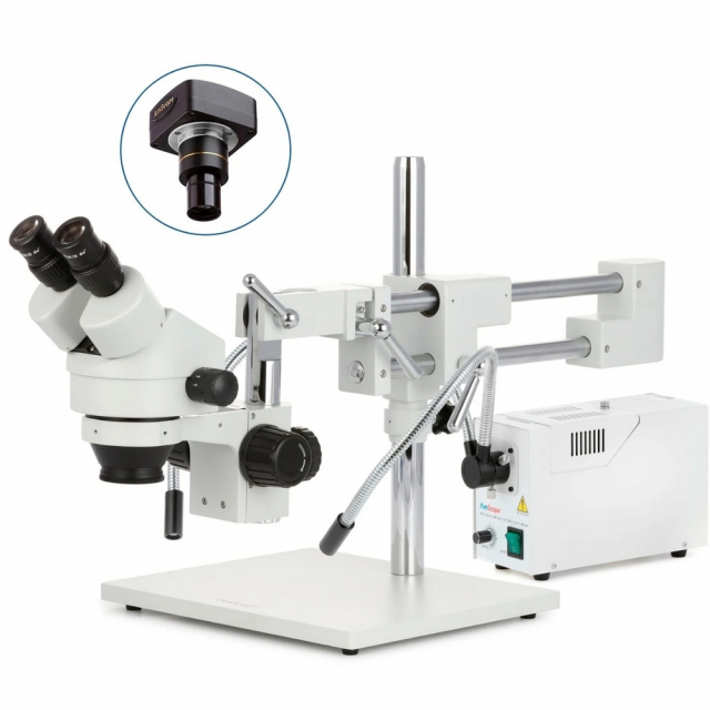 AmScope, SM-4BZZ-FOD-M, SM-4 Series Zoom Binocular Stereo Microscope, 3.5X-180X Magnification with 150W Halogen Dual Gooseneck Lights and 1.3MP, USB 2.0 C-Mount Camera on Double Arm Boom Stand