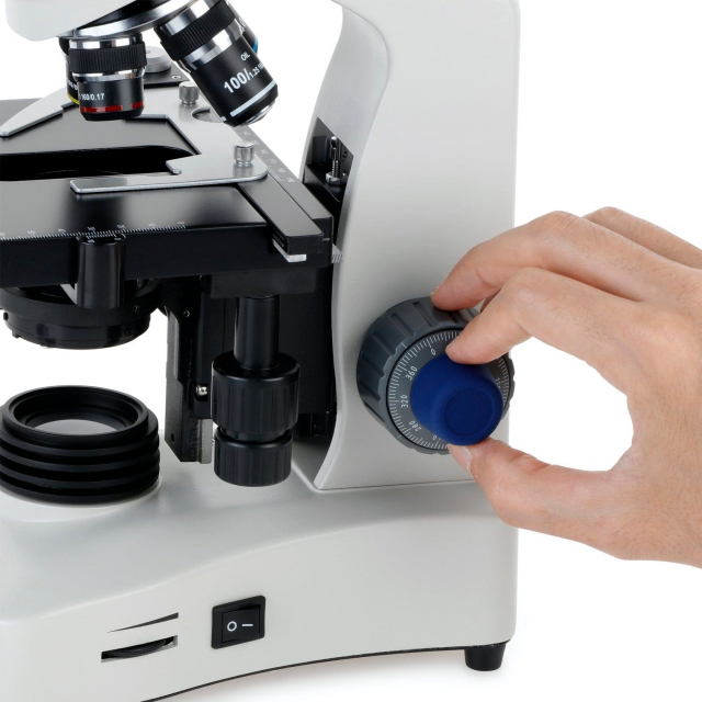 The objective turret provides instant access to 4 magnification levels to easily focus in on minute details from 40X to 1000X. This covers magnifications needed for studying hair follicles, cells, and bacteria. These high-quality lenses are achromatically corrected to improve resolution and color accuracy.