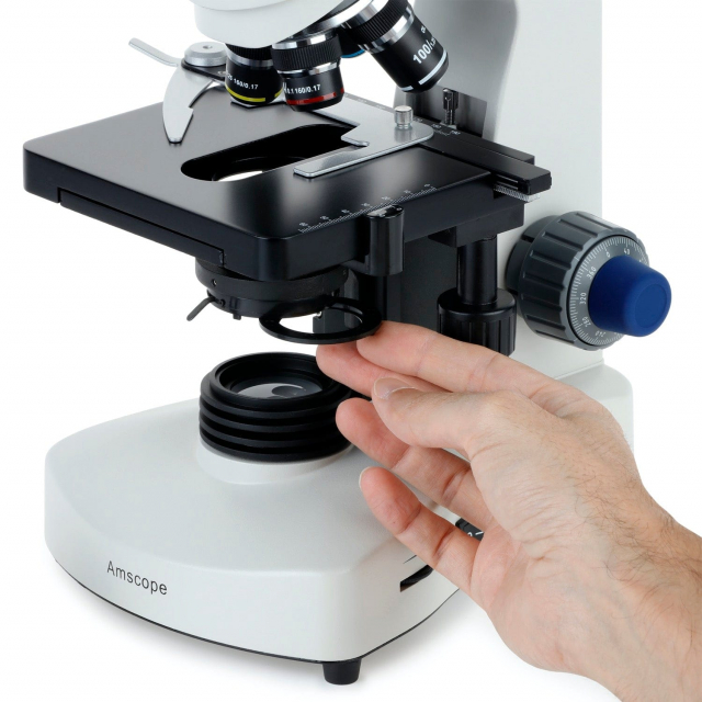 The LED sub-stage lighting provides cool, energy-efficient illumination. The light-source is daylight balanced to produce natural colors for imaging. The Abbe brightfield light condenser has a high 1.25 numerical aperture for oil-immersion, and an iris diaphragm to optimize contrast and depth-of-field. The condenser holder uses rack-and-pinion height adjustment for precision control.