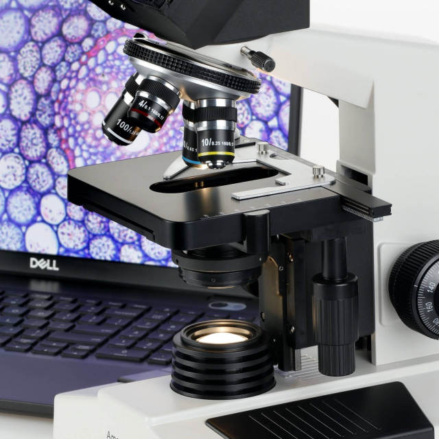The objective turret provides instant access to 4 magnification levels to easily focus in on minute details from 40X to 1000X. This covers magnifications needed for studying hair follicles, cells, and bacteria. These high-quality lenses are achromatically corrected to improve resolution and color accuracy.
