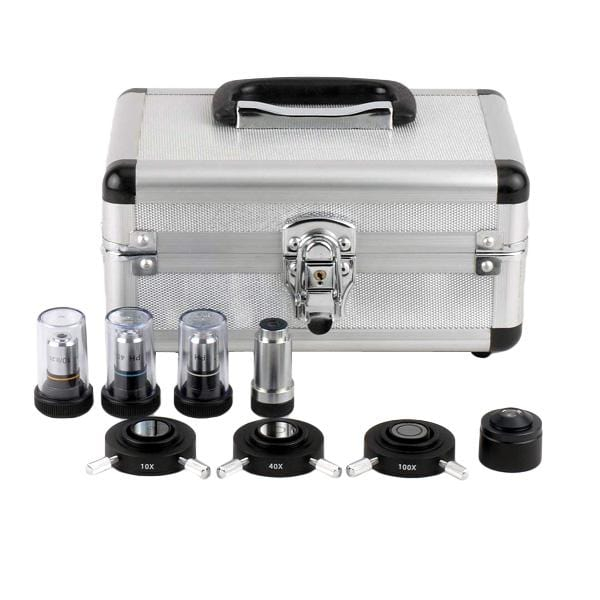 A phase-contrast kit is included, with three specialized objective lenses (10X, 40X, 100X) and a modular light condenser. Phase contrast is used to reveal detail in indistinct objects, such as unstained cells and microorganisms that would otherwise appear invisible. By using a combination of the specialized objective lenses and the modified light condenser, these invisible objects can be visualized by manipulating variations in phase.