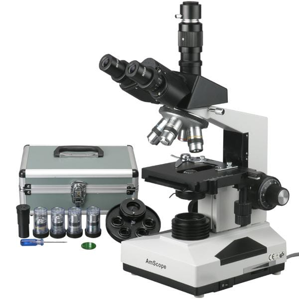AmScope, T490-PCT-MBI3, T490 Series Phase-Contrast Simul-Focal Trinocular Compound Microscope 40X-1000X Magnification with 20W Halogen, Turret Condenser, 3D Mechanical Stage and 1.2MP USB 3.0 C-mount Camera