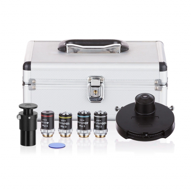 A phase-contrast kit is included with a turret condenser and 4 plan-achromatic phase-contrast objective lenses. Phase contrast is used to reveal detail in indistinct objects, such as unstained cells and microorganisms that would otherwise appear invisible. By using a combination of specialized objective lenses and a modified light condenser, these invisible objects can be visualized by manipulating variations in phase. This turret condenser allows you to easily rotate through the Four phase-contrast settings (4X, 10X, 40X, 100X). Each phase-contrast setting has a centerable annulus for proper alignment. Each of the phase-ring equipped objective lenses has plan-achromatic corrections for improved color and resolution, as well as edge-to-edge sharpness.