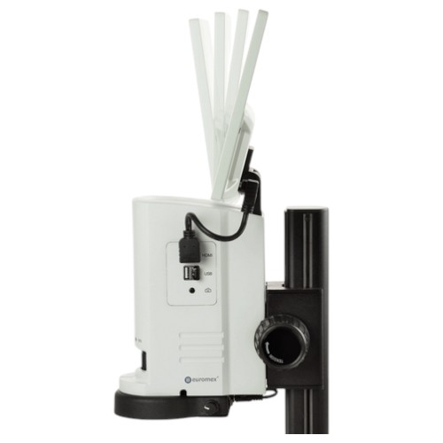 Two other USB ports accept the supplied 32 GB USB memory stick (up to 128 GB) and a supplied wireless mouse that drives the built-in on-screen software. The operator can also take and save images to the SD card by pressing on the capture button at the right side of the microscope body.