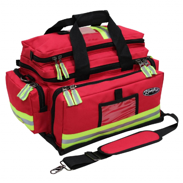Kemp USA's first and most popular bag with the following features: replaceable bottoms, dual-density structural foam, and strong 600D nylon construction for the highest quality and longest life. Optimum organization accommodates the most modern supplies used by emergency professionals: a front pocket organized with elastic loops and pouches; an external, easy-access top pocket; and an internal pouch. Includes highly visible reflective pull tabs and trim, all-metal black nickel hardware, tuck-away backpack harness, as well as a padded shoulder strap. High-stress points have been reinforced with bartack and cross-stitched.