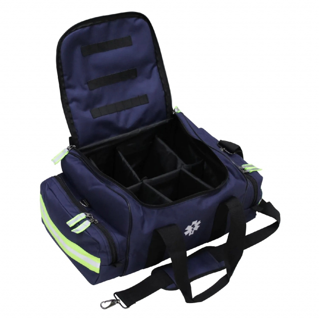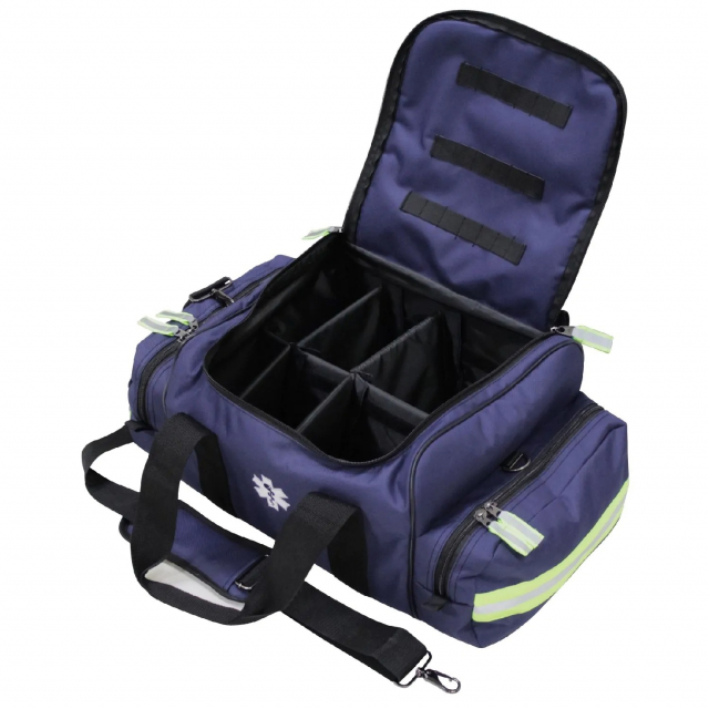 The Kemp USA Maxi Trauma Bag is bigger than first responder bag with more room for a larger assortment of first aid supplies. This bag is made with 600D nylon. Kemp USA Trauma Bags incorporate the latest technology and design to help you organize your BLS and advanced medical equipment. It comes with an adjustable shoulder strap for easier transport and has elastic loops on the top flap that can accommodate oral airways and small equipment. It has a removable fully adjustable padded center compartment and two large zippered end pockets with bright reflective trim.