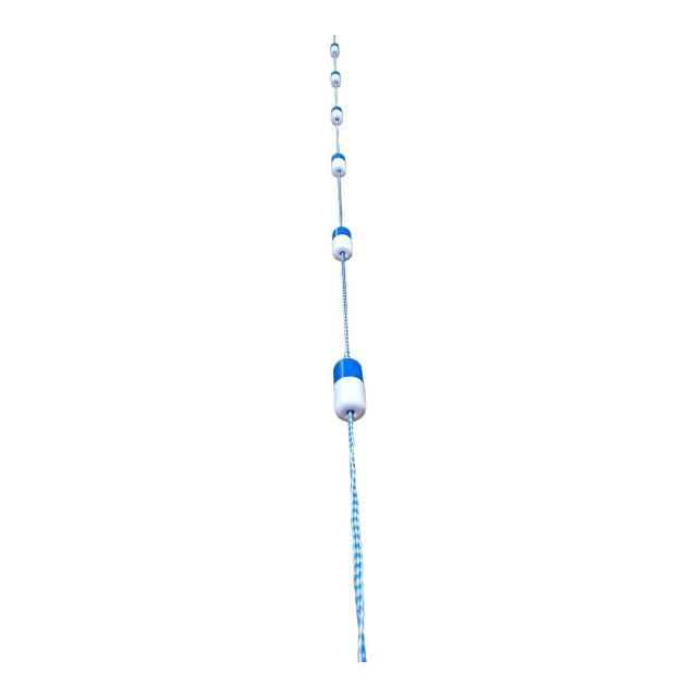 Kemp USA Pool divider rope and float kit, features a 3/4-inch royal blue / white rope complemented by 3x5" blue/white floats and rust-resistant metal hooks on the ends. All constructed from durable polypropylene rope. Requires no assembly, making it convenient for immediate use.