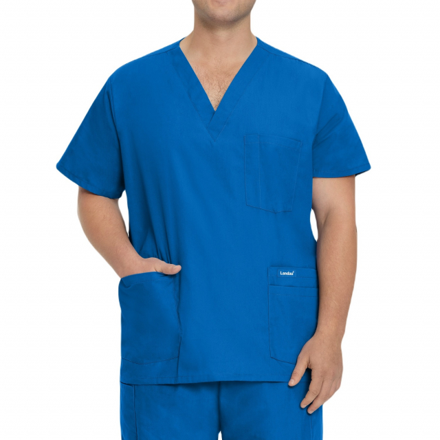 If this scrub top had more storage, we'd have to call it a garage! This five-pocket top is an easy-wear V-neck pullover with one breast pocket, two lower layered pockets on the left, and a single pocket with an interior cell phone division on the right. Locker loops make this scrub top easy to hang up after a long shift. These Heritage Landau medical clothes are so durable they are approved for commercial laundry and are made with classic generous fit for ease of movement. 65% Polyester/35% Combed Cotton Medium regular length 30'.