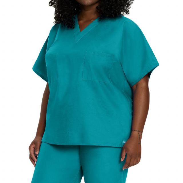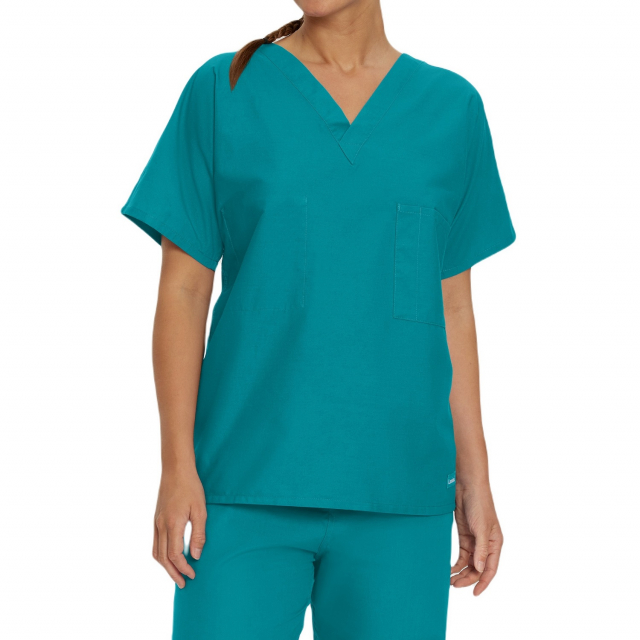 Comfortable and functional, this V-neck scrub top features a generous unisex fit complemented by dolman sleeves for added freedom of movement and all-day wearability. A reversible silhouette features one interior and one exterior breast pocket, ensuring your medical essentials are always within easy reach.
