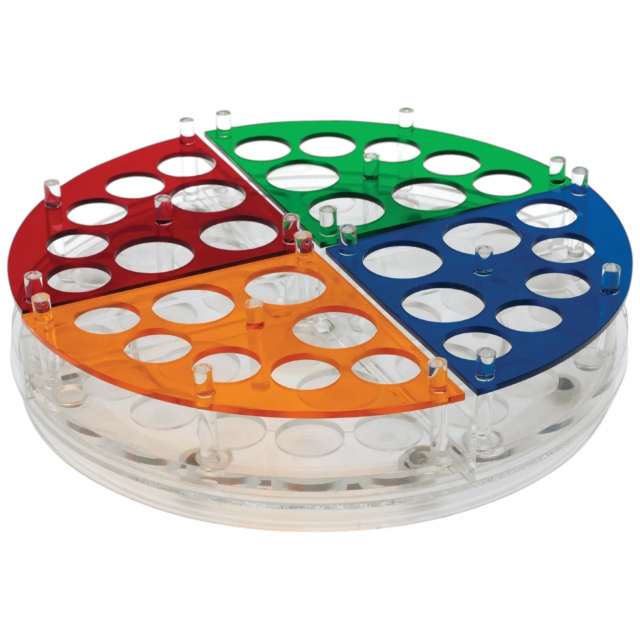 If you've ever used old microscope slide boxes or empty urine cups to store your open control vials, you'll see the benefit of the Working Vial Rack. It's designed to store, segregate, and quickly retrieve your controls and calibrators. The 10" durable acrylic rack has four pie-shaped segments that nest in a revolving base. Each segment has three 30mm and five 24mm holes.