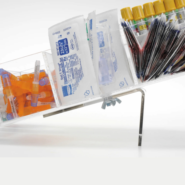 Designed with phlebotomists in mind. This organizer has compartments for all essential supplies to perform fast and efficient blood draws. Includes two tube racks - one for 13mm tubes ad one for 17mm tubes - plus a tilting stand to make accessing supplies easier.