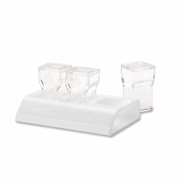 The organizer keeps the jars and their processing specimens together, prevents them from tipping over, and featuers a label area to identify stains.