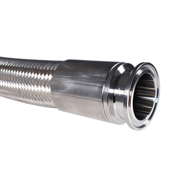 1.5" Tri-Clamp, Teflon Lined Stainless Steel Braided Hose - the ultimate solution for handling harsh chemicals, solvents, and high-pressure applications. Crafted with chemically resistant PTFE lining material, these hoses offer unrivaled durability and reliability. The inner core features a corrugated PTFE design for maximum flexibility, encased within a robust braided stainless steel outer sleeve. Each end of the hose is equipped with 1.5" Tri Clamp flanges for easy and secure connections. Please be mindful not to exceed the specified hose bend radius to avoid kinking the inner PTFE liner, which could compromise the integrity of the hose.