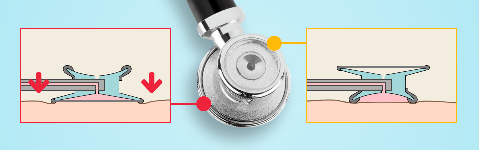 The diaphragm is ideal for high-pitched sounds, such as breath sounds and normal heartbeat sounds. The bell is suitable for low pitch sounds, like heart murmuring, and bowel sounds. Such methods are applied for bruits detection and for heart sounds. For cardiac checkings, you may start listening with the diaphragm, and then with the bell. When you use the bell, hold the stethoscope to the patient’s skin neatly for the lowest sounds and firmly for the higher ones.